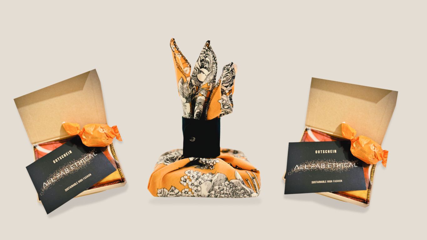 Ab einem Gutscheinwert von 75€ erhaltet ihr zusätzlich eine hochwertige Geschenkverpackung mit einem attraktiven Gutschein aus Karton, drapiert in einen Upcycling-Stoff.